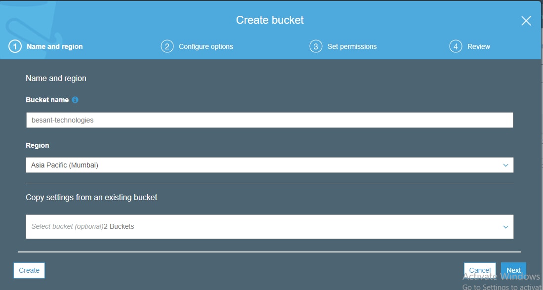 - Once you see the S3 console from the above link, you will find a prompt window. At the end of the prompt window, there will be a button “Create Bucket”. Click that button to create a bucket.