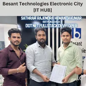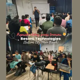 Besant Technologies is a No.1 Software Training Institute in Electronic City, offering you Job Oriented courses on Full Stack, Cloud Computing, Data Science,Data Analytics, Machine Learning, Python, Software Testing, Selenium & Other Certified IT programs. Our mission is to provide 100% placements to students those who enroll for our specialized courses. Our Placement assistance starts with Resume preparation, Mock Interviews by real working professionals, Aptitude test training & Interviews.