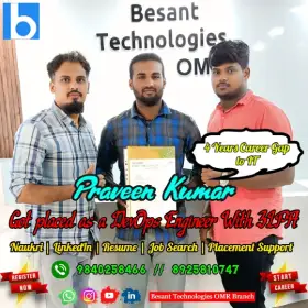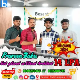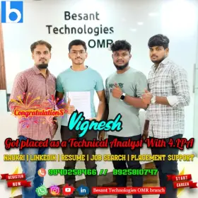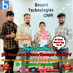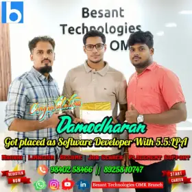 We have been in the IT Training Field for Last 12+ Years and helped many Students to get their Dream Job in Top Companies. OMR is the best place to search IT , BPO & KPO Jobs in Chennai Since Most of the Top Software Companies like TCS, Cognizant, Infosys , Accenture are located near by Sholinganallur. Lot of Hostel available near by our Institute to Stay and learn for Students who came from other Cities. Enroll in Top Trending Courses at Besant Technologies OMR to get your Dream Jobs with High Package.