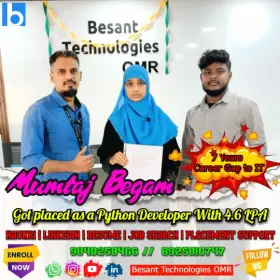 If you are looking for a Best Software (IT) Training Institute near Sholinganallur, ptc, thoraipakkam, mettukuppam, SRP, kandanchavadi, perungudi, navallur, chemancheri, OMR areas in Chennai Please reach Besant technologies OMR Branch. Please read our students original reviews about our OMR Branch performance here – Besant Technologies OMR Reviews