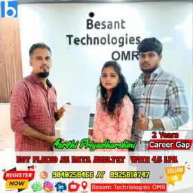 If you are looking for Best Software Training Institute in Chennai at OMR then Besant Technologies OMR is the Right Answer. We are the No.1 Software Training Center trained more than 1M+ Students including working Professionals , Freshers & College Students. Walk-in to our Besant Technologies OMR Branch to avail the best IT Software Training services. We are Offering Trending Courses like AWS, Big data Hadoop, Data Science With Python, Java, C, C++, Android, Selenium, Devops, Oracle, AI and Machine Learning, Angularjs, Tableau, RPA Tools, Blue Prism and Analytics in OMR Chennai. We open on all days including Sunday.