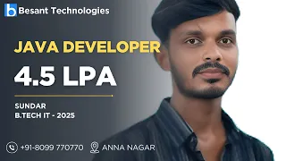 Besant Technologies offers a wide range of JAVA Training in Chennai to meet the growing corporate needs. Right from the beginning of the career Java developers will have a decent package and they get very good pay once they get succeeded in their first project.