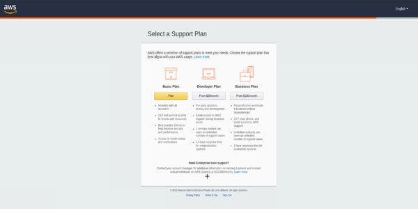 On choosing the support plan option, you’ll be provided with several plans, if you are going to use it just for training purpose, then choose the basic plan to continue.